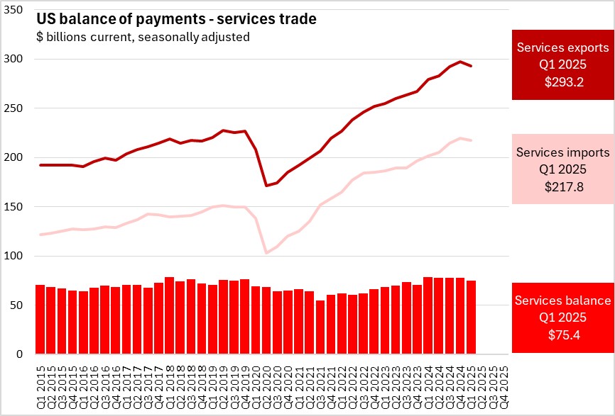 In Q1 2025, US services exports decreased $4.4 billion to $293.2 billion, while services imports decreased $1.8 billion to $217.8 billion.