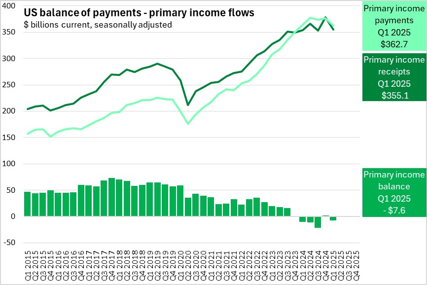 In Q1 2025, US primary income receipts decreased $22.9 billion to $355.1 billion, while primary income payments decreased $13.7 billion to $362.7 billion.