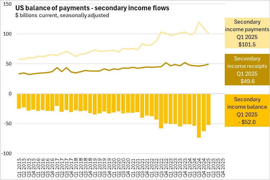 In Q1 2025, US secondary income receipts increased $2.3 billion to $49.6 billion while US secondary income payments decreased $8.4 billion to $101.5 billion.