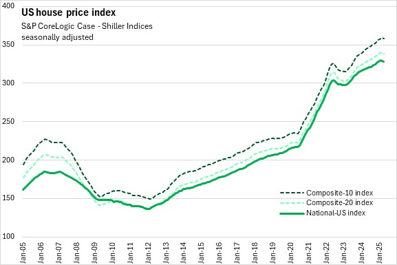 After bottoming out in 2012, US house prices grew at a steady pace up to 2020 before accelerating from summer 2020 to summer 2022. US house prices declined from summer 2022 to January 2023. In 2023 and 2024, US house prices gradually increased and passed the peak of June 2022. In recent months, US house prices are declining following a gradual increasing trend.