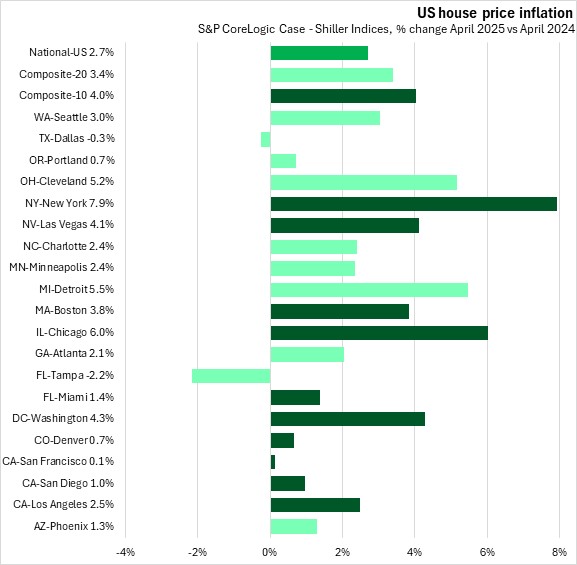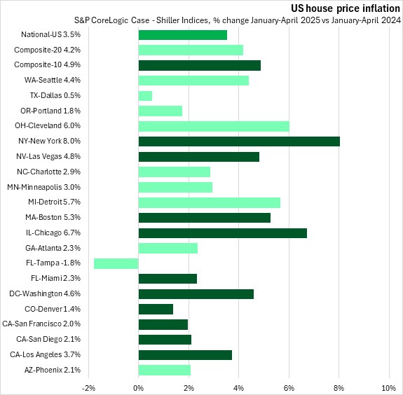 US national house prices rose by 3.5% in the first four months of 2025 when compared to the same period last year. The 20-city composite average was up 4.2% and the 10-city composite was up 4.9%.