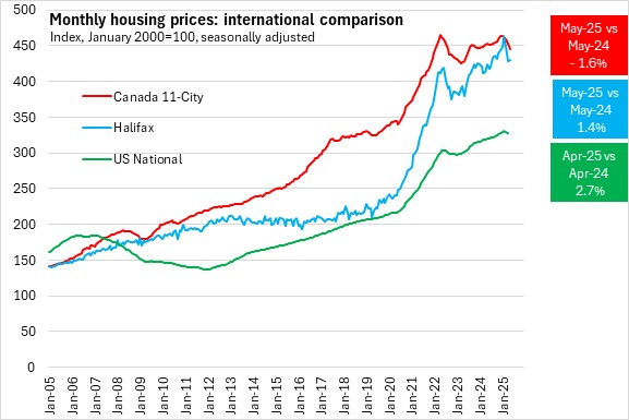 Canadian urban house price growth (measured by the Teranet-National Bank House Price Index) grew more rapidly starting in 2016 and accelerated again in 2020. However, in recent months, house price inflation in the US has grown more rapidly than in Canada. Canada's 11-city composite house prices fell 1.6% year-over-year in May 2025.