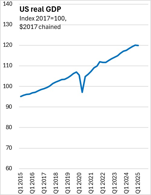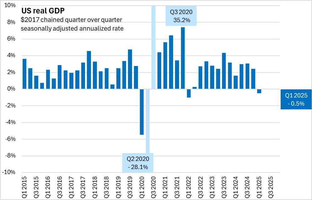 US real GDP growth was estimated at -0.5% (seasonally adjusted annualized rate) for Q1 2025 in the final revised estimate. This remained the first quarterly contraction since Q1 2022.
