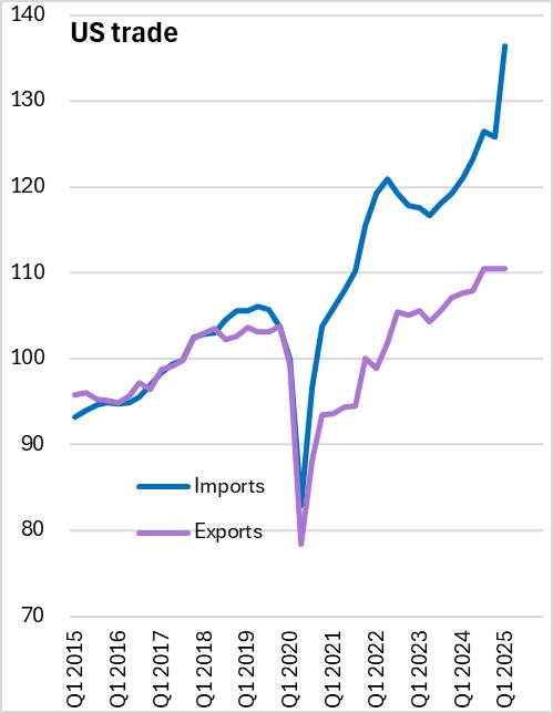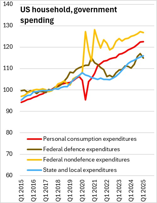 The decrease in real GDP was driven by increases in imports (+38.0%), which are subtracted from GDP, and declines in federal government defence spending (-7.1%), non-defence spending (-1.2%), and residential investment (-1.3%). These were partially offset by increases in exports (+0.4%), state and local government spending (+2.0%), and non-residential investment (+10.3%).