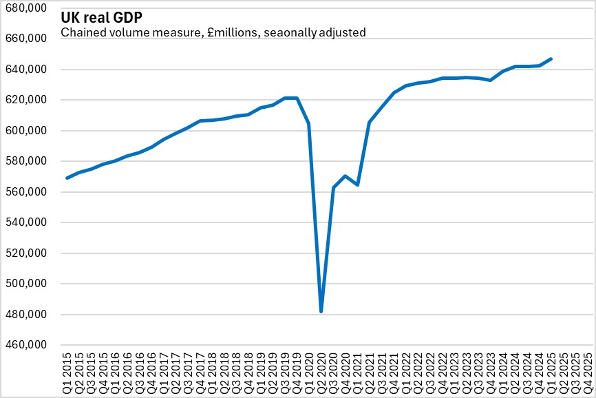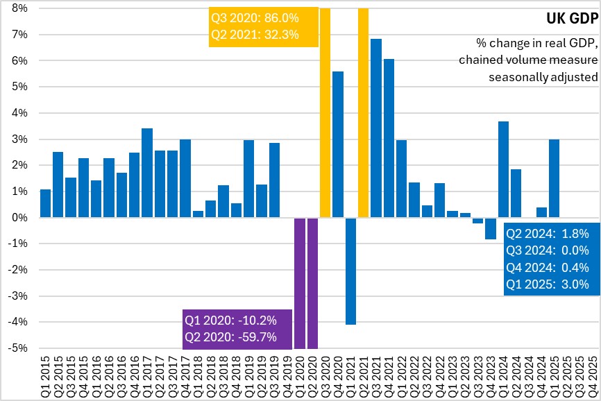 UK real GDP grew at a seasonally adjusted annualized rate of 3.0% in Q1 2025, accelerating from a revised estimate of 0.4% for Q4 2024. This was the UK's strongest real GDP growth since the first quarter of 2024.