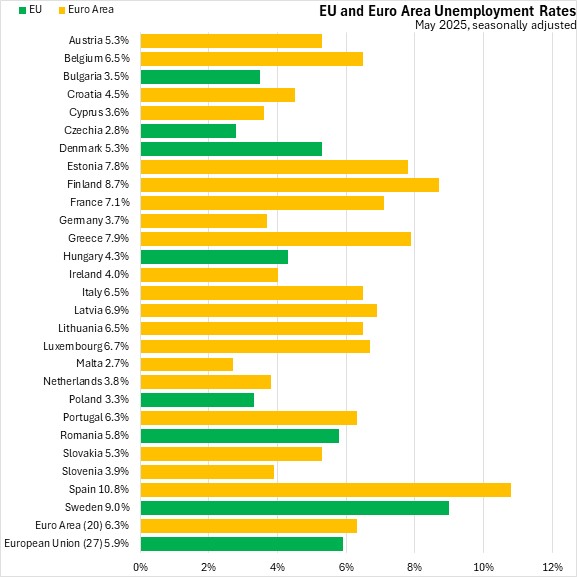 Eurostat has reported that the unemployment rate in the Euro Area was up to 6.3% in May 2025. For the broader 27 countries of the entire European Union, the unemployment rate was unchanged at 5.9% in May 2025.