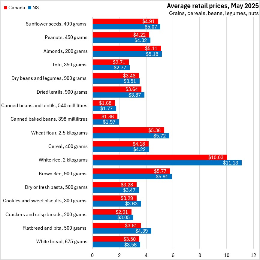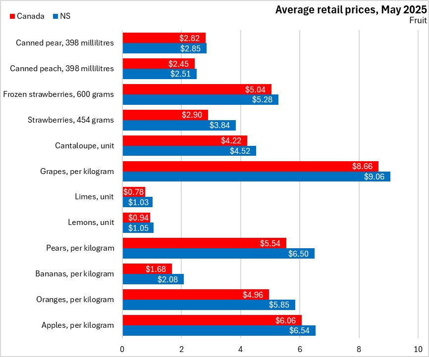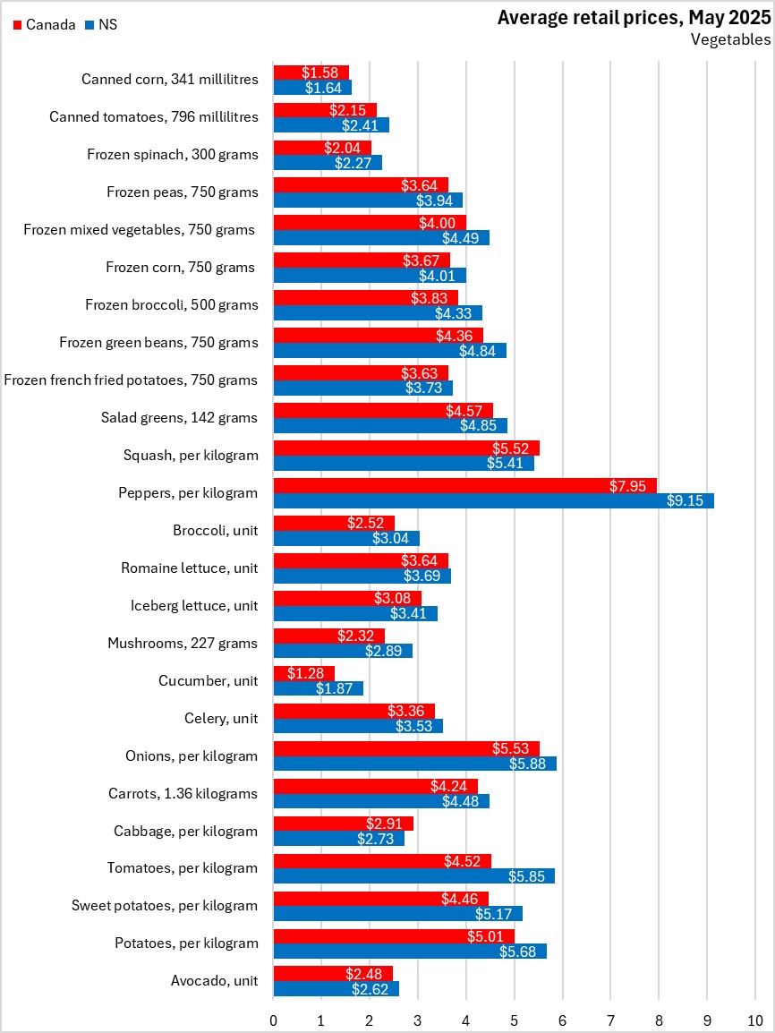 Nova Scotia food prices were more than 10% higher than the national averages for the following products: pork loin, whole chicken, canned tuna, cream, oranges, bananas, pears, lemons, limes, strawberries, potatoes, sweet potatoes, tomatoes, cucumber, mushrooms, iceberg lettuce, broccoli, peppers, frozen vegetables (green beans, broccoli, mixed vegetables, spinach), flatbread/pita, cookies, white rice, vegetable oil, canola oil, canned tomatoes