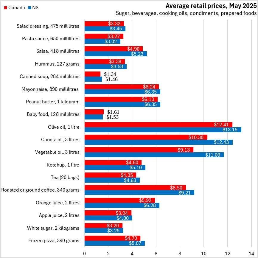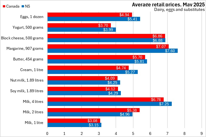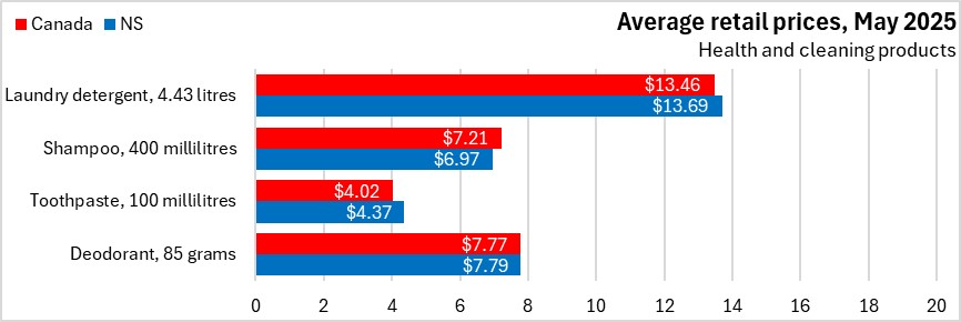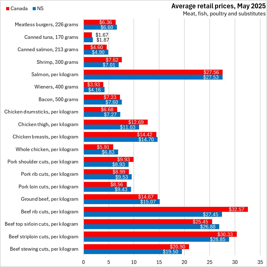 Nova Scotia food prices were below national averages for the following products: beef (stewing, striploin, rib), pork shoulder, chicken thigh, salmon, shrimp, milk (2 litre), cabbage, squash, baby food, infant formula, pasta sauce, shampoo