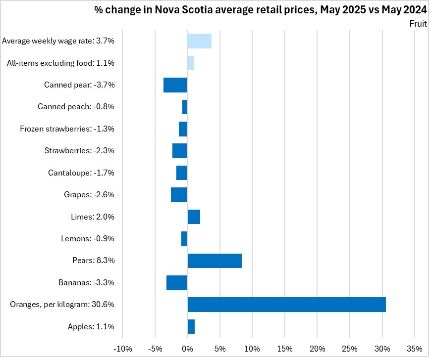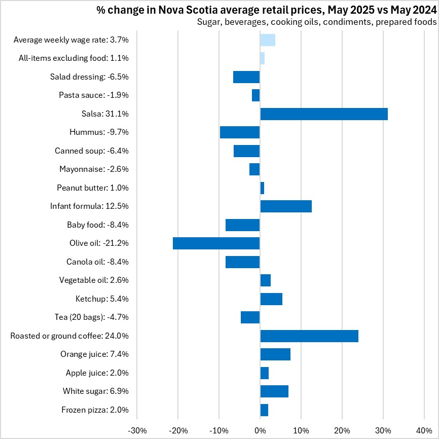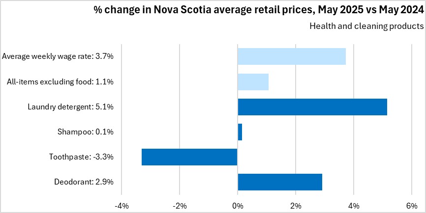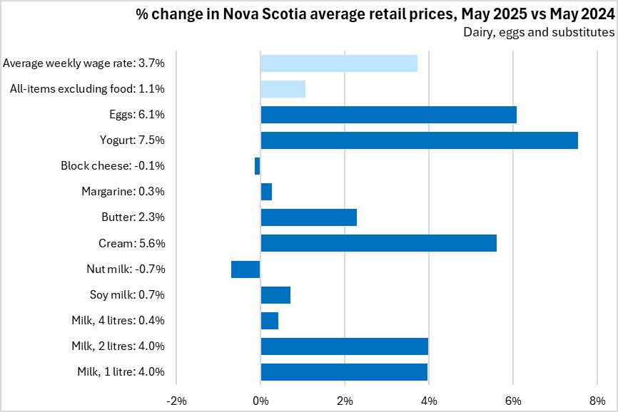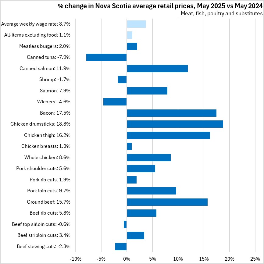 Over the last year (May 2025 vs May 2024), the consumer price index for all items in Nova Scotia excluding food increased by 1.1%. Food prices as a whole rose 2.7%. At the same time average weekly earnings across all Nova Scotia industries increased by 3.7%.