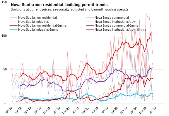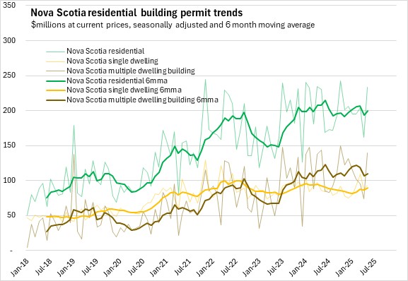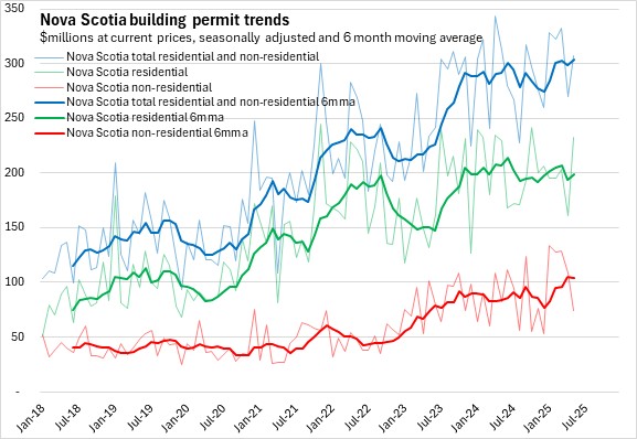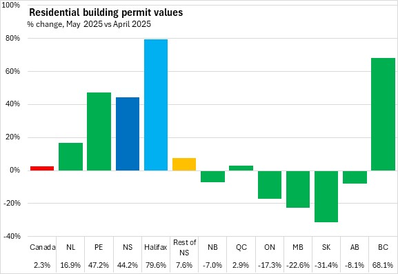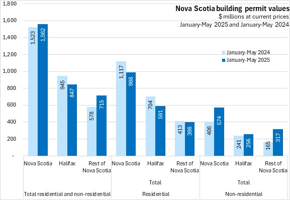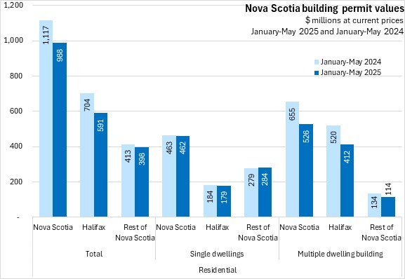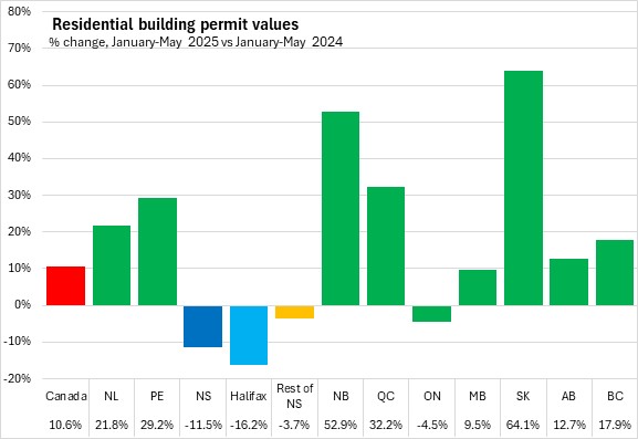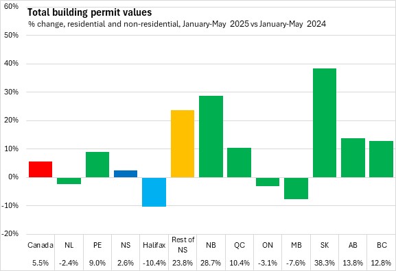 Nova Scotia's total building permits (residential and non-residential) were up 2.6% in the first five months of the year comparing with the same period in 2024. Halifax permits declined 10.4% and outside the city permit values increased 23.8%. National permits were up 5.5%. Building permit values were up in seven provinces, with Saskatchewan and New Brunswick reporting the fastest increases. Manitoba reported the fastest decline.