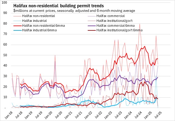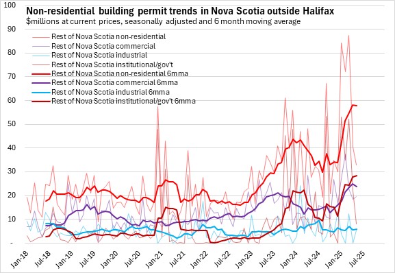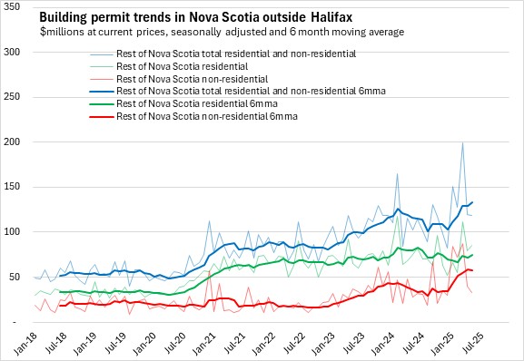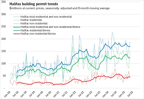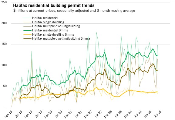 Trends in residential permit values reflect the differences in housing markets for Halifax and the rest of the province. In Halifax, growth in permit values for multi-unit dwellings has outpaced growth in single-dwelling unit permits. Outside the city the situation is reversed, where single dwelling unit permits are more common than permits for multi-unit structures. Residential permits trended down in the second half of 2024 due to the decline among multiples in Halifax and lower permits for single unit dwellings. In recent months, residential permits are broadly flat as the multiples offset some decine among singles through 2025.