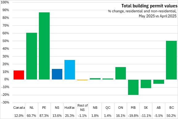 Nova Scotia's total building permits (residential and non-residential) rose 13.6% to $307.3 million. Halifax permits rose 25.3% to $188.8 million while permits outside the city dropped 1.1% to $118.5 million. National permits grew 12.0% to $13.11 billion. Total building permit values were up in seven provinces, led by Prince Edward Island and Newfoundland and Labrador. Manitoba reported the fastest monthly decline in building permit values.