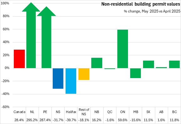 Nova Scotia's non-residential building permits fell 31.7% to $74.3 million, the fastest monthly decline among provinces. Halifax permits dropped 39.7% to $41.4 million. Outside the city, non-residential permit values declined 18.1% to $33.0 million. National non-residential building permit values rose 28.4% to $5.57 billion. Non-residential permit values were up in seven of ten provinces, led by Newfoundland and Labrador and Prince Edward Island.