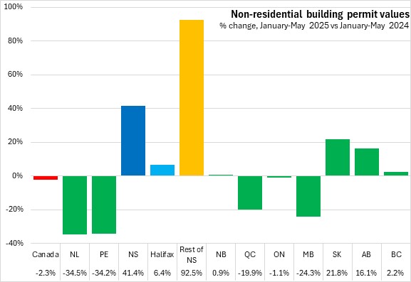 Nova Scotia's non-residential building permits rose 41.4% in the first five months of 2025 (compared with the same period in 2024), the fastest rise in non-residential permit values among provinces. Halifax permits increased 6.4% while non-residential permits outside the city rose 92.5%. National non-residential building permit values declined 2.3%. Non-residential permit values were up in five provinces, led by Nova Scotia. Newfoundland and Labrador and Prince Edward Island reported the steepest decline.