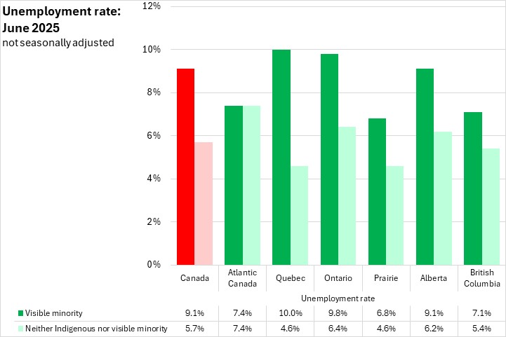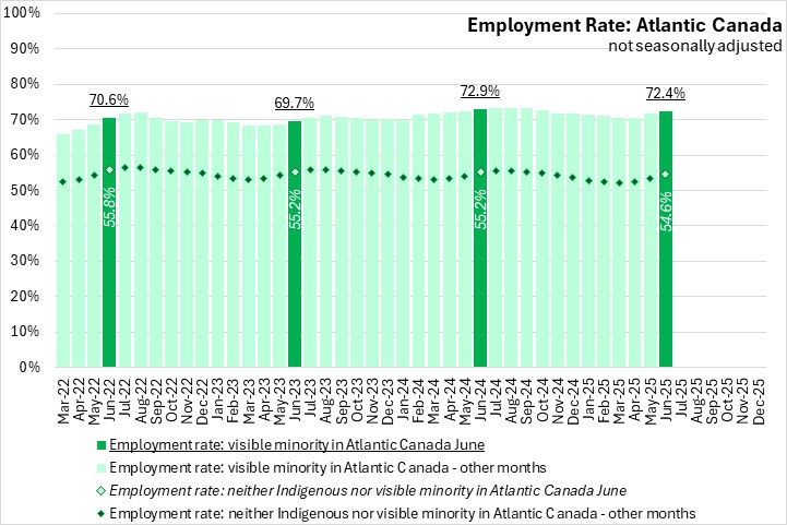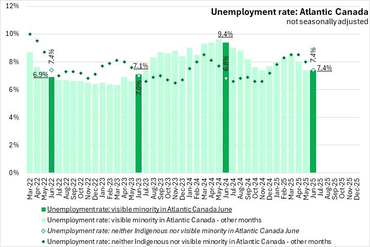 In June 2025, the unemployment rate for the visible minority population was the same as for the population that was neither Indigenous nor in a visible minority population in Atlantic Canada. This was the fifth consecutive month that the unemployment rate of visible minority population was the same or lower than the rate for those who identified as neither Indigenous nor in a visible minority population.