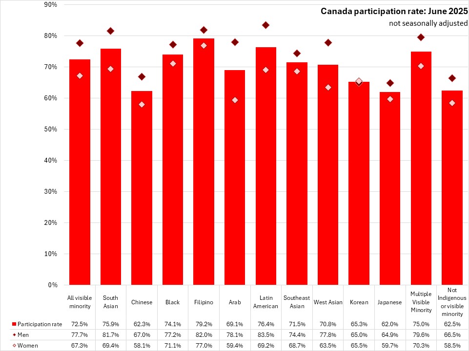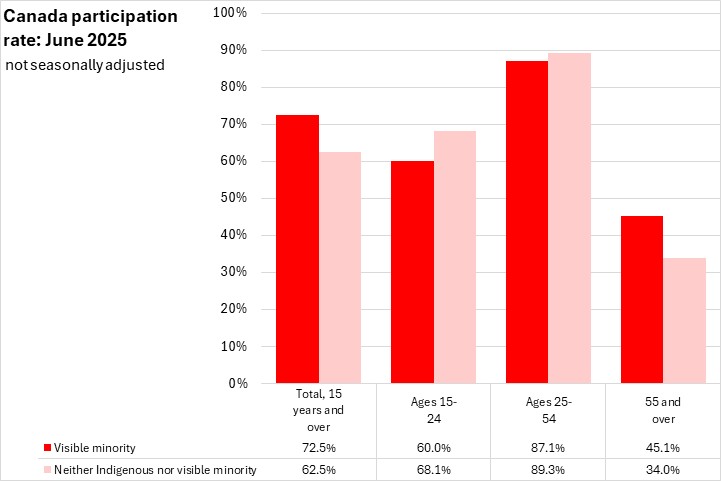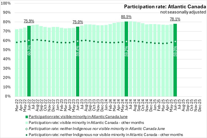 National participation rates were higher for those who identify with a visible minority population (72.5%) than for those that did not identify as Indigenous or in a visible minority population (62.5%). Participation rates of those who identify with a visible minority population were higher in all regions in June 2025. In Atlantic Canada, those who identify with a visible minority population reported a 78.1% participation rate, compared to a 59.0% participation rate for those that do not identify as Indigenous or in a visible minority population, the largest gap among regions.