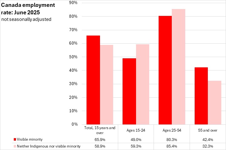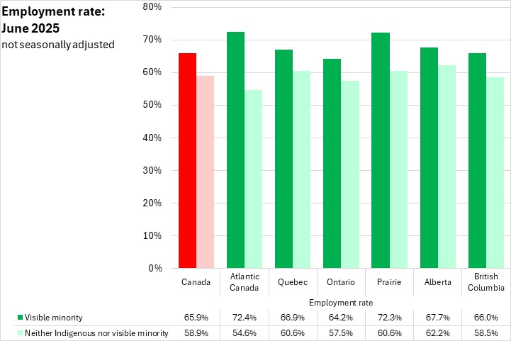 Nationally, employment rates were higher for those who identified with visible minority populations (65.9%) than for those who did not identify as Indigenous or in a visible minority population (58.9%). Employment rates were higher for those who identify with visible minority populations in every region when compared against those who do not identify as Indigenous or in a visible minority population in June 2025. The gap between the employment rates for those who identified with visible minority populations (72.4%) and those who did not (54.6%) was highest in Atlantic Canada.