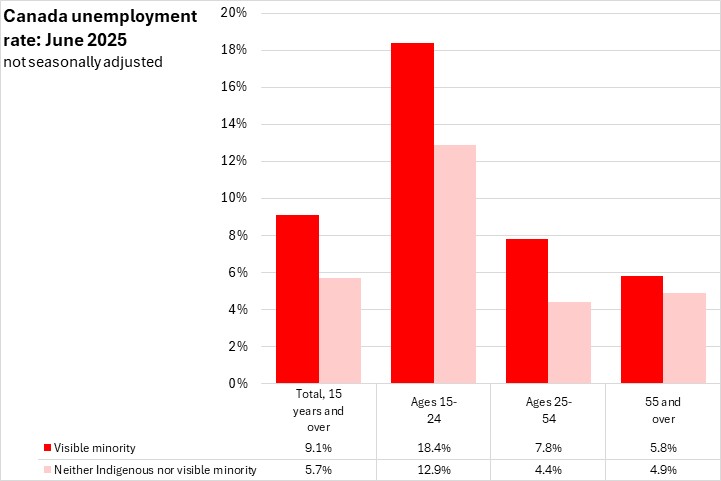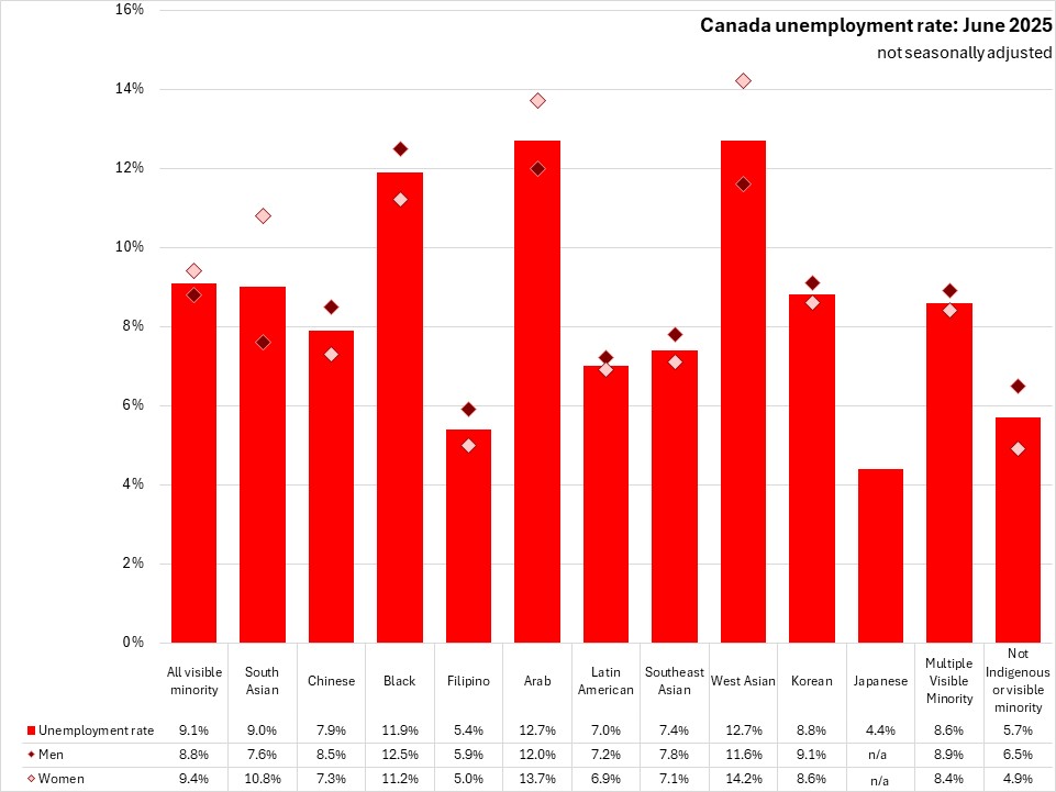 In June 2025, the unemployment rates of males in all visible minority populations were slightly lower (8.8%) than for females in visible minority populations (9.4%), which was not the case for populations that did not identify as Indigenous or visible minorities. Among specific populations, female unemployment rates were lower than males among Chinese, Black, Filipino, Latin American, Southeast Asian and Korean populations as well as for those that identified with multiple visible minority populations.