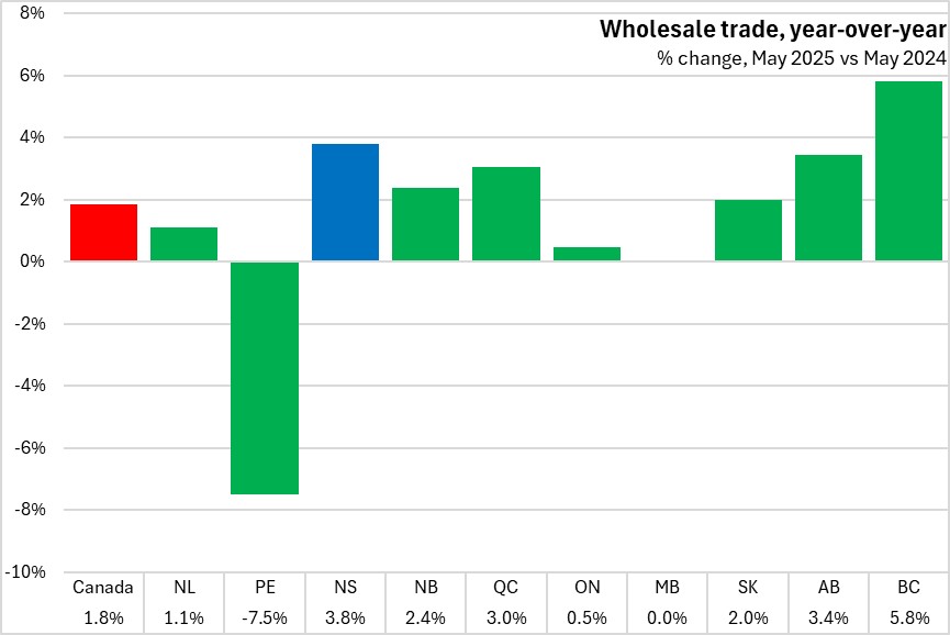 Nova Scotia wholesale trade grew 3.8% in May when compared with the same month last year. Canada's wholesale trade grew 1.8%, year-over-year. All provinces except Prince Edward Island reported year-over-year increases in wholesale trade. British Columbia reported the fastest year-over-year rise (followed by Nova Scotia).