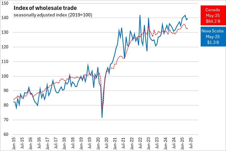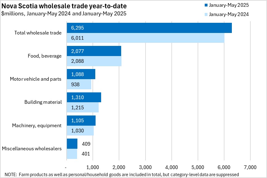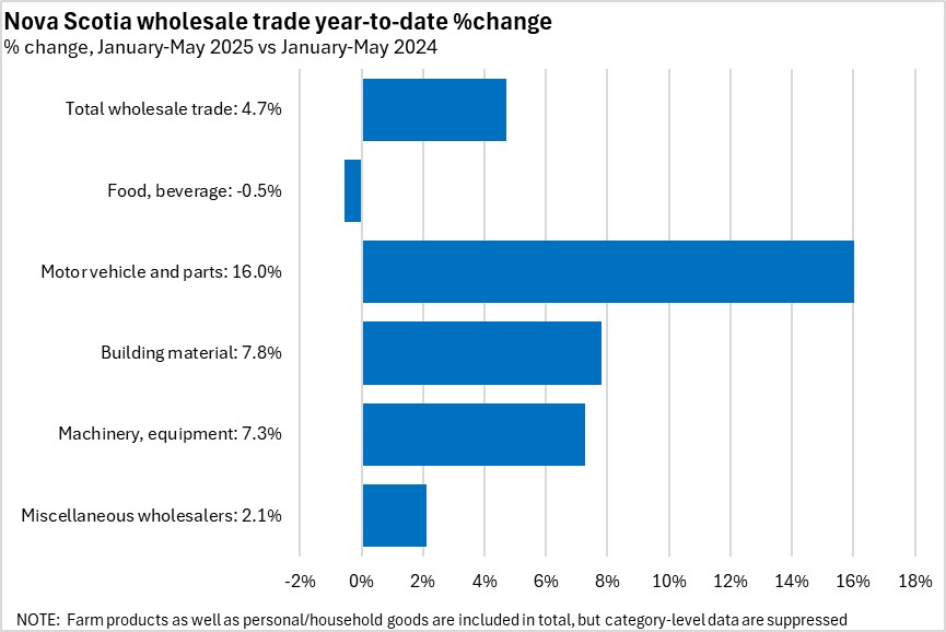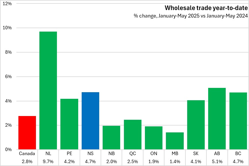 Nova Scotia wholesale trade increased 4.7% in the first five months of 2025 compared to the same period of 2024. Canada's wholesale trade increased 2.8%. All provinces reported year-to-date increases in wholesale trade. Newfoundland and Labrador reported the fastest gain (Manitoba had the slowest).