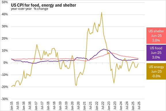 Compared to June 2024, the US energy price index was down 0.8%. The gasoline price index was down 8.3%. The food index rose 3.0% and the shelter index was up 3.8% year-over-year.