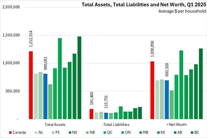 Compared to Q1 2024, national assets per household increased by $34,249 while liabilities increased by $5,965, bringing national net worth up by $28,286. Nova Scotia’s assets increased by $15,668 per household while liabilities grew by $4,542 from Q1 2024 to Q1 2025, increasing Nova Scotia's net worth per household by $11,127.