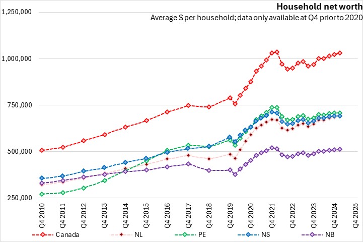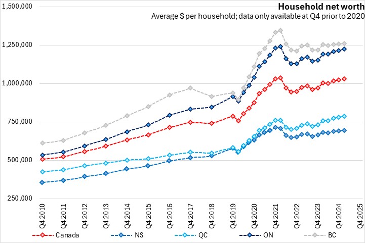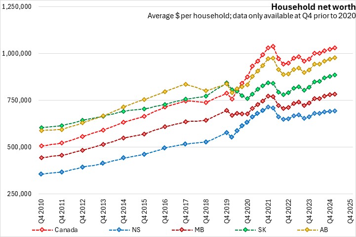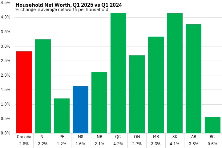Nova Scotia's net worth increased by 1.6% from Q1 2024 to Q1 2025, slower than the national average (+2.8%). All provinces reported gains over the same quarter the previous year. Québec and Saskatchewan reported the fastest gains in net worth. British Columbia reported the slowest gains.