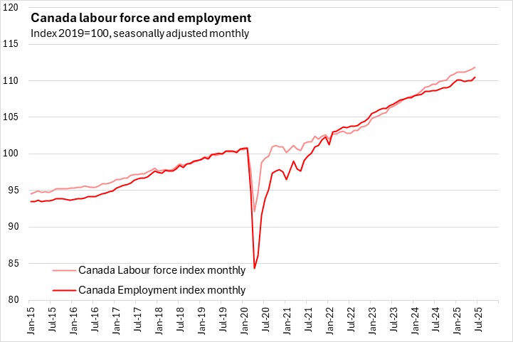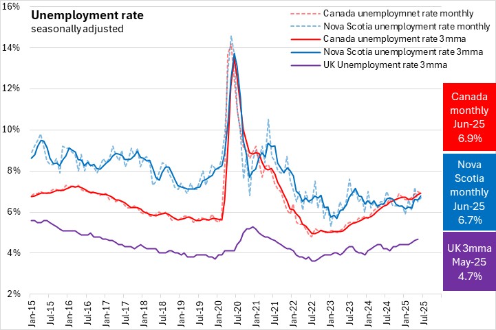 Source: UK Labour Market Statistics; UK Labour Market Data; Statistics Canada. Table 14-10-0287-01 Labour force characteristics, monthly, seasonally adjusted and trend-cycle, last 5 months