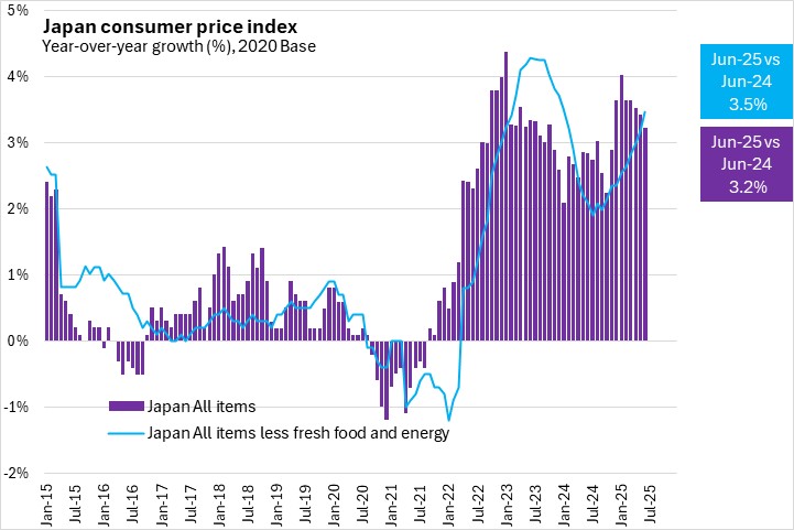 Japan’s inflation (all items, year-over-year growth in consumer price index) was 3.2% in June 2025, down from 3.4% in May. Japan's underlying inflation (all items excluding fresh food and energy) was 3.5%, up from 3.2% in the previous month.