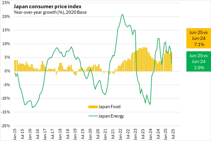 Japan's energy prices were up 2.9% in June 2025 compared with June 2024. Japan's food inflation rate was up 7.1% over this period.