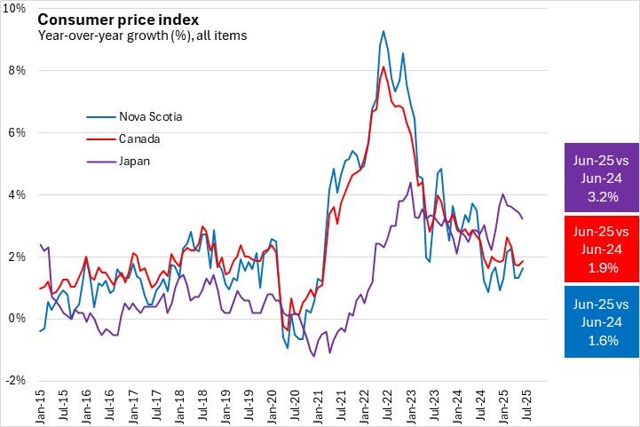 Japan's inflation was highest at the end of 2022 and the beginning of 2023, but was lower than inflation in Canada. With Canada's and Nova Scotia's inflation rates decelerating faster in 2024, inflation has been higher in Japan than in Nova Scotia for the past nine months and reached 2022 levels.