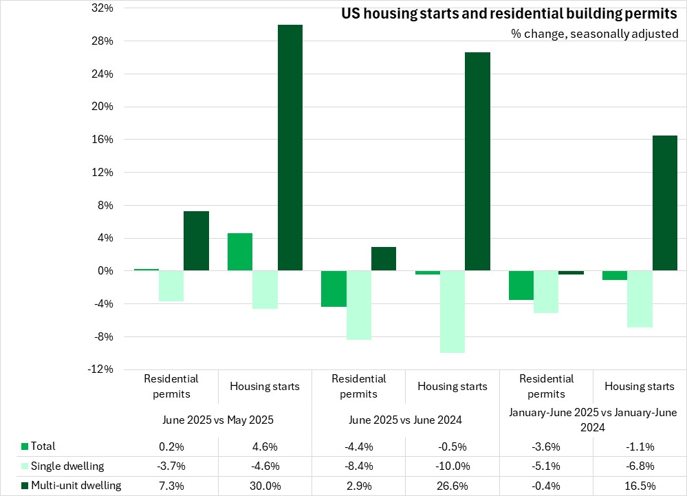 In the first six months of 2025, US housing starts were down 1.1%, with declines in single unit starts (-6.8%) and increases in multi-unit starts (+16.5%).
