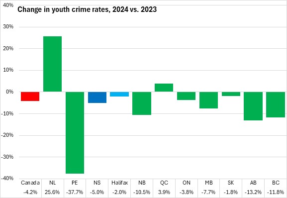 Youth crime in Nova Scotia declined by 5.0% in 2024, including a 2.0% decline in Halifax. Nationally, youth crime was down 4.2%, with declines in eight provinces last year. The fastest decline was reported in Prince Edward Island. Youth crime rose in Newfoundland and Labrador and Québec.