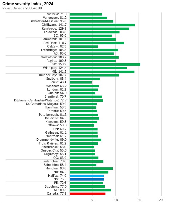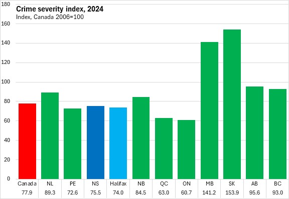 The Crime Severity Index (CSI), which measures both volume and severity of the types of crime, was 75.5 in Nova Scotia and 74.0 in Halifax. The national crime severity index was 77.9 with the highest rates in Manitoba and Saskatchewan and the lowest rates in Ontario and Québec.