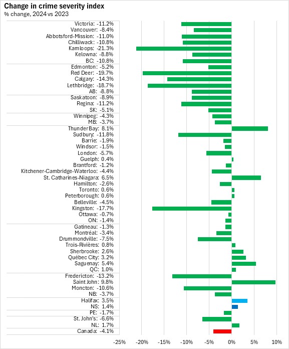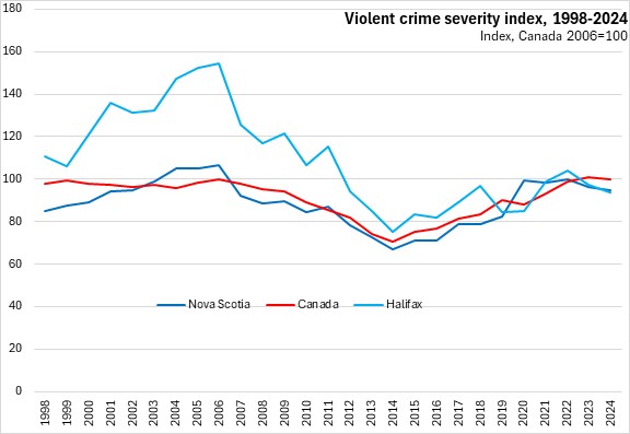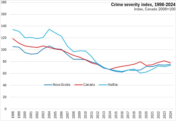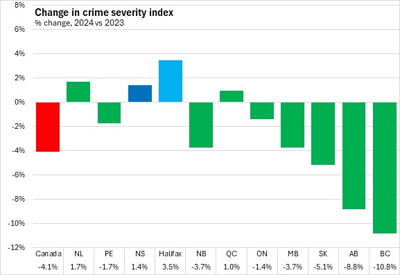 The crime severity index rose 1.4% in Nova Scotia from 2023 to 2024 and increased 3.5% in Halifax. Nationally, crime severity was down 4.1% with declines in seven provinces led by British Columbia. Crime severity rose in Newfoundland and Labrador, Nova Scotia, and Québec.