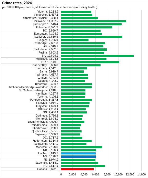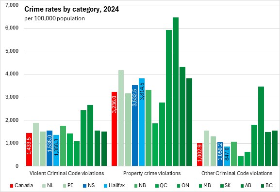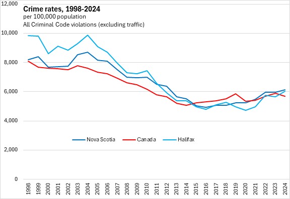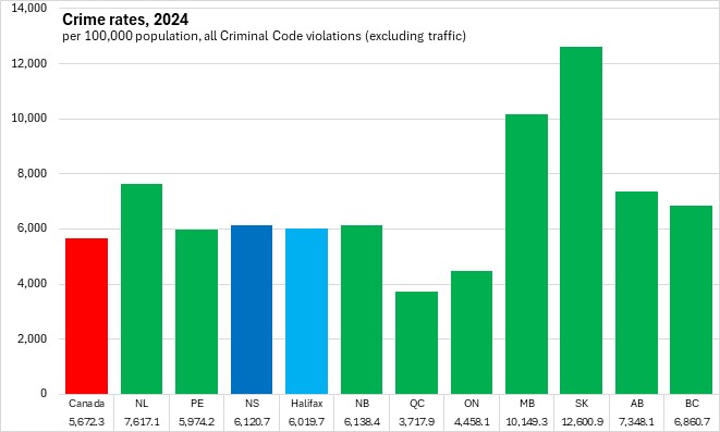 Nova Scotia's crime rate (Criminal Code violations, excluding traffic) increased 2.6% in 2024, while there was a 6.3% increase in Halifax's crime rate.