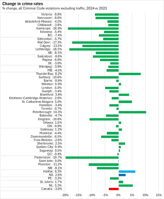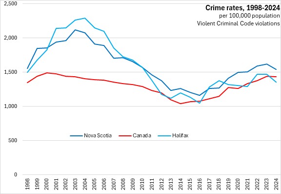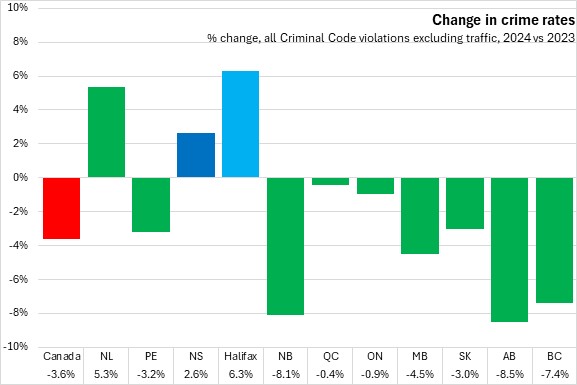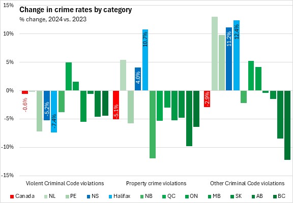 The rate of violent crimes was down 5.2% in Nova Scotia from 2023 to 2024 and down 7.4% in Halifax. Violent crime was down 0.6% nationally with declines in all provinces except Québec and Ontario. Prince Edward Island reported the fastest decline in violent crime.