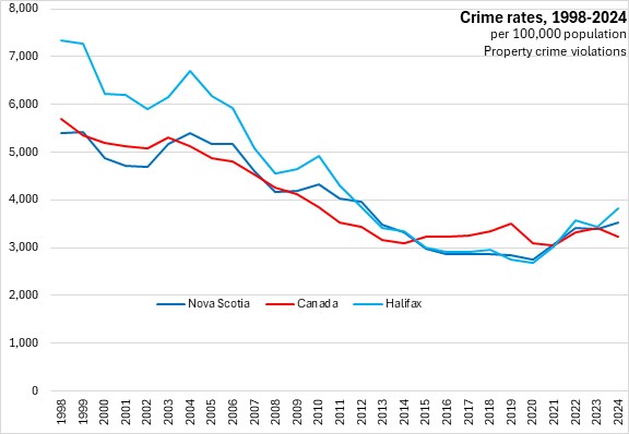 Property crime rates were up 4.0% in Nova Scotia from 2023 to 2024 with a 10.7% increase in Halifax. Nationally, property crime rates were down 5.1% with the fastest decline in New Brunswick. Newfoundland and Labrador and Nova Scotia reported increases in property crime violations in 2024.