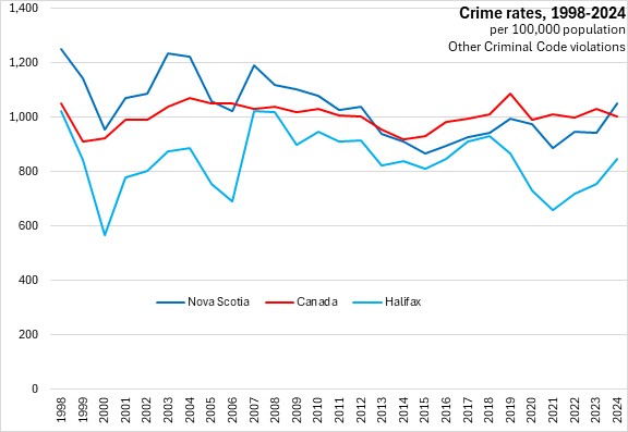 Per 100,000 residents, there were 3,532.5 property incidents in Nova Scotia and 1,050.2 other Criminal Code violations in 2024. Halifax reported 3,814.5 property crimes and 847.0 other Criminal Code violations per 100,000 residents in 2024. Nationally, there were 3,236.0 property violations and 1,002.9 other Criminal Code violations per 100,000 residents.