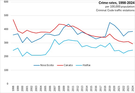 In the last year, the rate of Nova Scotia's Criminal Code traffic violations increased by 1.0% (+2.0% in Halifax). Nationally, Criminal Code traffic violations were down 5.7% with the fastest decline in British Columbia (followed by Saskatchewan and Alberta). Criminal Code traffic violations were up in Newfoundland and Labrador and Nova Scotia in 2024.