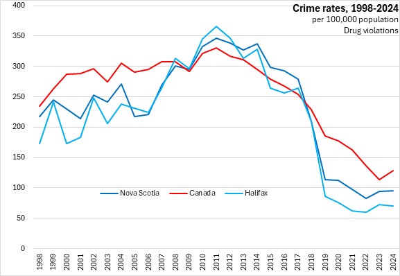 Although there was a slight increase in 2024, Nova Scotia's drug crime rates remain substantially lower than they were prior to 2018.