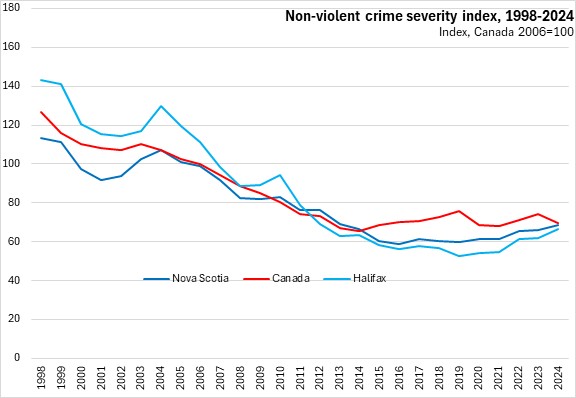 There have been increases in the severity of non-violent crimes in each of the last five years for Nova Scotia and Halifax.