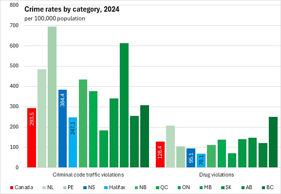 Nova Scotia reported 384.4 Criminal Code traffic violations per 100,000 residents in 2024, which was above the national average of 293.5. There were 247.1 Criminal Code traffic violations per 100,000 residents in Halifax. Criminal Code traffic violations were highest in Prince Edward Island and Saskatchewan (lowest in Ontario).