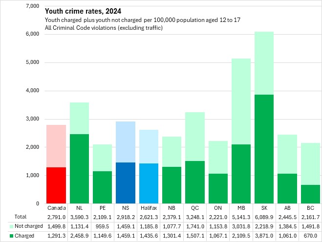 Nova Scotia's youth crime rate in 2024 was 2,918.2 violations per 100,000 residents aged 12-17, which was higher than the national youth crime rate (2,791.0). The youth crime rate was lower in Halifax (2,621.3). Youth crime rates were higher in Manitoba and Saskatchewan. Note the youth crime rates are divided into youth who are charged for a reported crime as well as youth who are not charged for a reported crime.