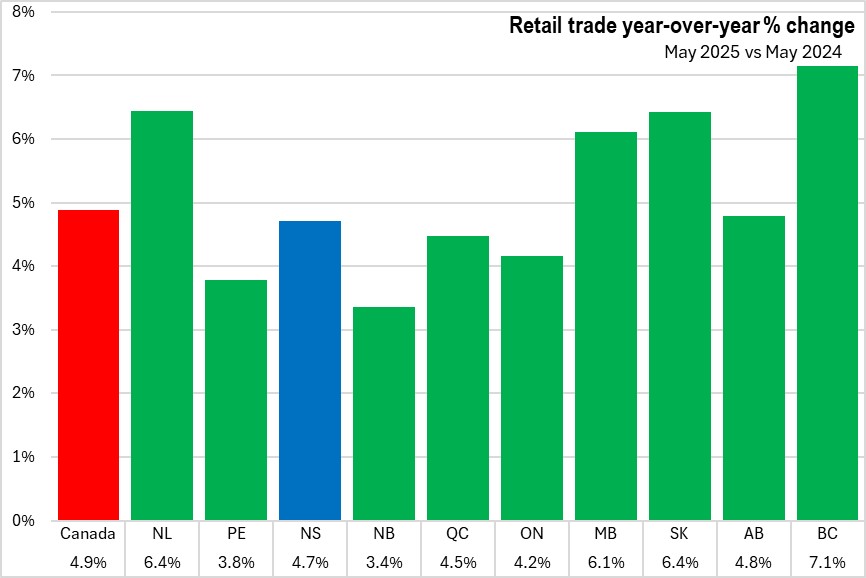 Nova Scotia retail trade increased 4.7% compared to the same month last year. Nationally, retail trade was up 4.9% year-over-year. All ten provinces reported year-over-year increases in retail trade, led by British Columbia. New Brunswick reported smallest increase.