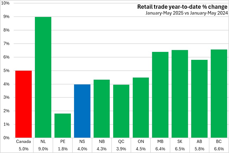 Nova Scotia retail trade increased 4.0% year-to-date compared to the same period last year. Nationally, retail trade was up 5.0% year-to-date. All provinces reported year-to-date increases in retail trade, led by Newfoundland and Labrador. Prince Edward Island reported the slowest growth.