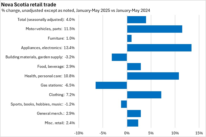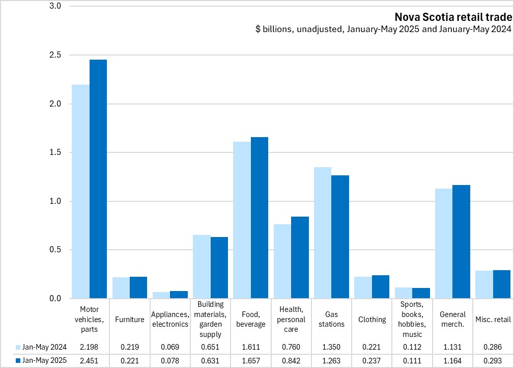 In dollar terms, motor vehicles/parts ($2.451 billion), food/beverage ($1.657 billion), gas stations ($1.263 billion) and general merchandise stores ($1.164 billion) contributed the most to Nova Scotia's retail sales in January-May 2025.