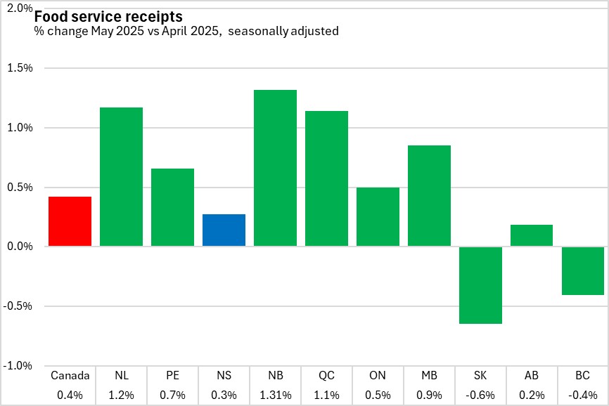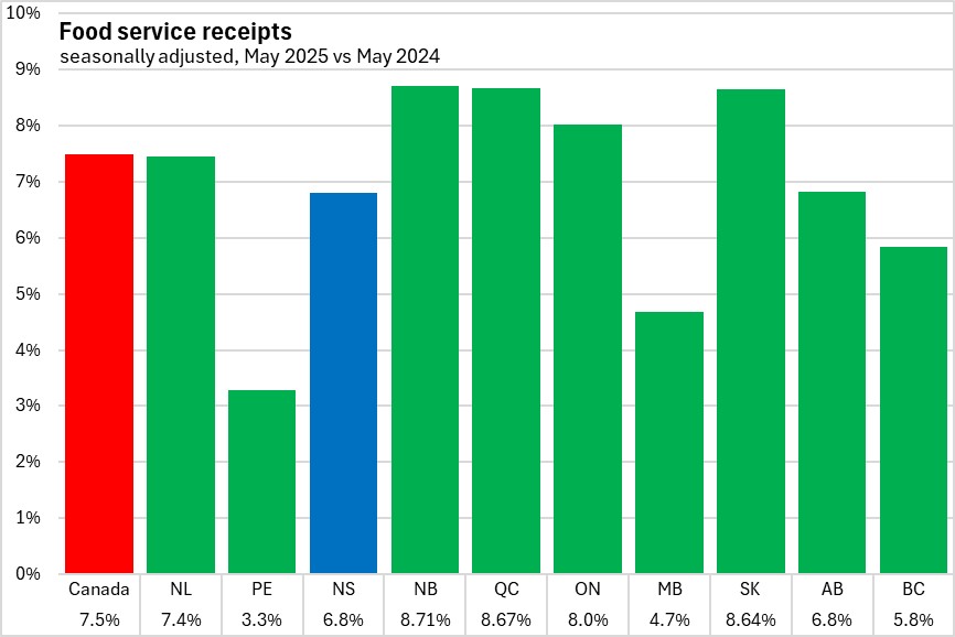 Nova Scotia food services and drinking places receipts increased 6.8% year-over-year. Canada's food services and drinking places receipts increased 7.5%. There were year-over-year gains in all provinces led by New Brunswick, Quebec and Saskatchewan. Prince Edward Island reported the smallest gain.