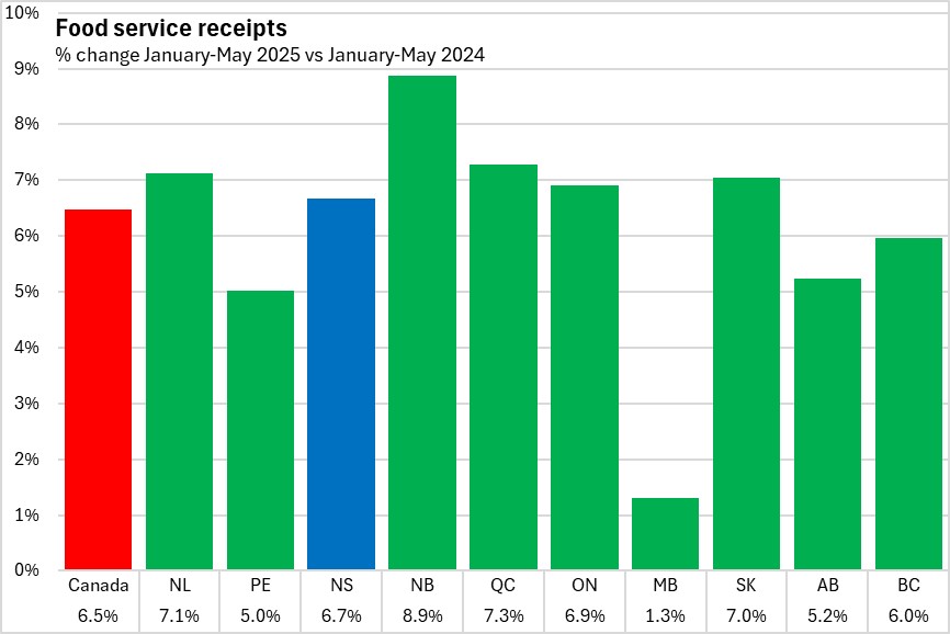Nova Scotia's year-to-date food services and drinking places receipts increased 6.7%. Nationally food services and drinking places receipts increased 6.5%. All provinces reported a year-to-date increase in receipts. New Brunswick reported the fastest percentage gain in year-to-date food service receipts while Manitoba reported the smallest increase.