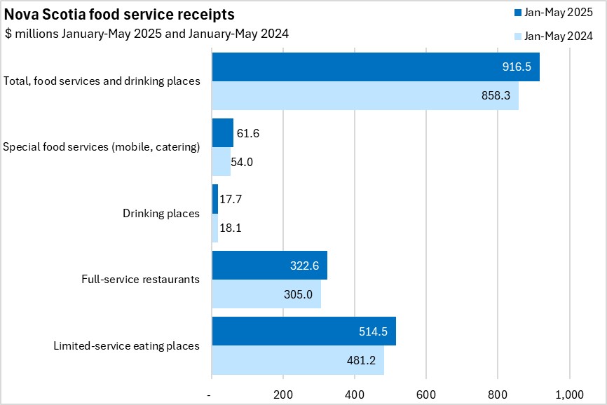 Nova Scotia food services and drinking places receipts increased 0.3% to $201.3 million. Canada's food services and drinking places receipts increased by 0.4% to $8.5 billion. Across Canada, eight provinces reported increased receipts for food services and drinking places, led by New Brunswick. Saskatchewan reported the steepest decrease.